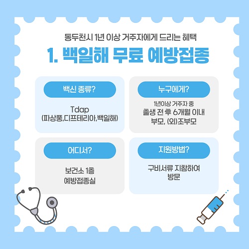 Áö¿ø ´ë»óÀÚ´Â Áֹεî·Ï»ó µ¿µÎõ½Ã 1³â ÀÌ»ó °ÅÁÖÀÚ Áß ¢º27ÁÖ~36ÁÖ ÀӽźΠ¢ºÃâ»ý Àü·ÈÄ 6°³¿ù À̳» ¿µ¾ÆÀÇ ºÎ¸ð ¹× (¿Ü) Á¶ºÎ¸ð°¡ ÇØ´çµÇ¸ç ´ë»óÀÚ¿¡°Ô ¹éÀÏÇØ(Tdap ÆÄ»ódz·µðÇÁÅ׸®¾Æ·¹éÀÏÇØ) ¹«·á ¿¹¹æÁ¢Á¾À» Á¦°øÇÑ´Ù.