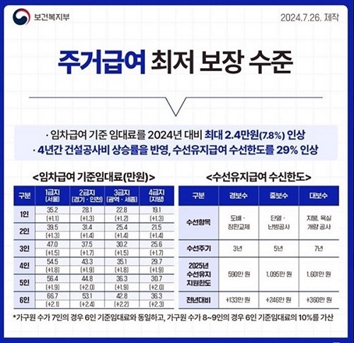 2025³â ±âÁØ ÁßÀ§¼ÒµæÀÌ ÀλóµÊ¿¡ µû¶ó, Áְű޿© ¼ö±ÞÀÚ ¼±Á¤ ±âÁØÀº ¡ã1ÀÎ °¡±¸ ¼ÒµæÀÎÁ¤¾× 114¸¸8õ166¿ø ¡ã2ÀÎ °¡±¸´Â 188¸¸7õ676¿ø ¡ã3ÀÎ °¡±¸´Â 241¸¸2õ169¿ø ¡ã4ÀÎ °¡±¸´Â 292¸¸6õ931¿øÀ¸·Î È®´ëµÈ´Ù.