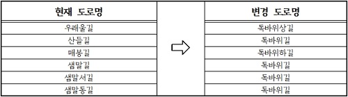 ½Ã´Â ÁÖ¼ÒÁ¤º¸À§¿øÈ¸ÀÇ Àǰῡ µû¶ó °°Àº ³¯ µµ·Î¸í º¯°æ °í½Ã¸¦ ¿Ï·áÇßÀ¸¸ç, ÇØ´ç ±¸°£ ³» ½ÅÃà °Ç¹°Àº »õ·Î º¯°æµÈ µ¶¹ÙÀ§ ¸íĪÀÌ Æ÷ÇÔµÈ µµ·Î¸íÁÖ¼Ò¸¦ ºÎ¿©¹Þ°Ô µÈ´Ù.