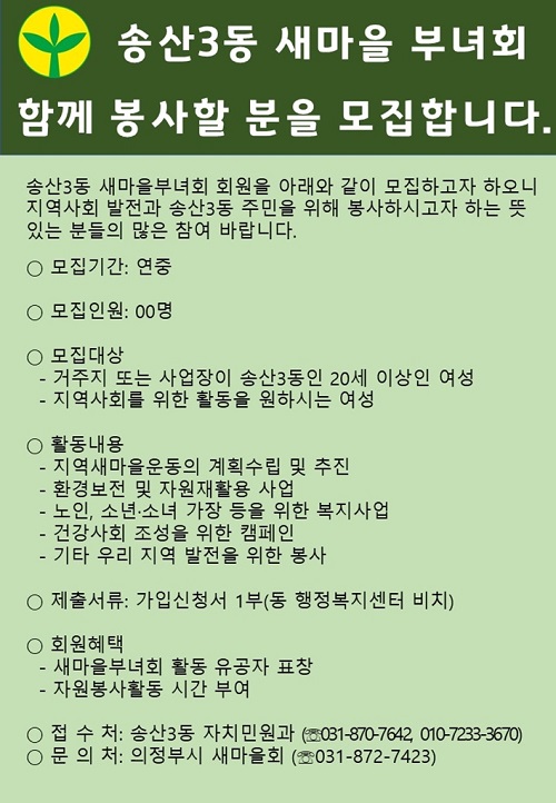 ÀÇÁ¤ºÎ½Ã ¼Û»ê3µ¿ÇàÁ¤º¹Áö¼¾ÅÍ(±Ç¿ª±¹Àå ÀÌ¿µÀç)´Â 2¿ù ¸»±îÁö ¼Û»ê3µ¿ »õ¸¶À»ºÎ³àȸ¿Í ÇÔ²² ºÀ»çÇÒ È¸¿øÀ» ¸ðÁýÇÑ´Ù.
