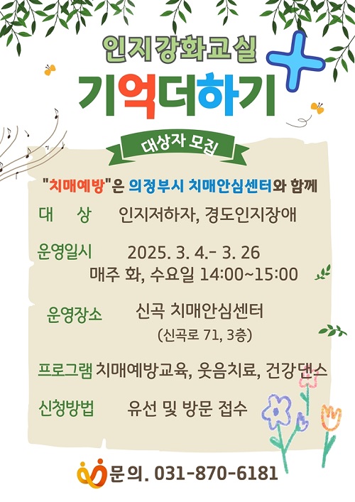 ÀÇÁ¤ºÎ½Ã º¸°Ç¼Ò(¼ÒÀå À忬±¹) Ä¡¸Å¾È½É¼¾ÅÍ´Â Ä¡¸Å ¿¹¹æ°ú ÀÎÁö±â´É Çâ»óÀ» À§ÇÑ ÀÎÁö°È±³½Ç ‘±â¾ï´õÇϱâ’ÀÇ Âü¿©ÀÚ¸¦ ¸ðÁýÇÑ´Ù.