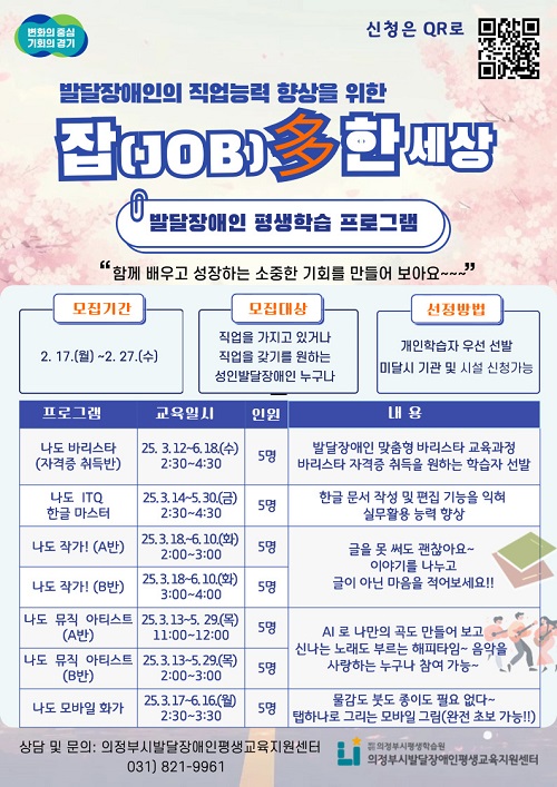 ÀÇÁ¤ºÎ½Ã¹ß´ÞÀå¾ÖÀÎÆò»ý±³À°Áö¿ø¼¾ÅÍ(ÀÌÇÏ ¼¾ÅÍ)´Â 2¿ù 17ÀϺÎÅÍ ¹ß´ÞÀå¾ÖÀÎÀ» ´ë»óÀ¸·Î ÇÑ Á÷¾÷±³À° ºÐ¾ß Æò»ýÇнÀ ÇÁ·Î±×·¥ ÇнÀÀÚ¸¦ ¸ðÁýÇÑ´Ù.