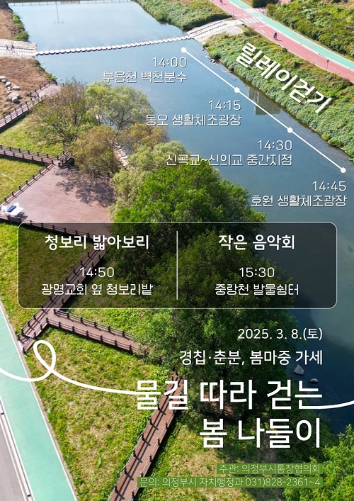 ÀÇÁ¤ºÎ½Ã(½ÃÀå ±èµ¿±Ù)´Â 3¿ù 8ÀÏ ÀÇÁ¤ºÎ½Ã ÅëÀåÇùÀÇȸ°¡ ½Ã¹Îµé°ú ÇÔ²² º½À» ¸¸³£ÇÒ ¼ö ÀÖ´Â ‘¹°±æ µû¶ó °È´Â º½³ªµéÀÌ’ Çà»ç¸¦ °³ÃÖÇÑ´Ù.