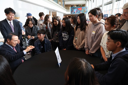 Çѱ¹°è Çлýµé°úÀÇ °£´ãȸ¿¡¼ º§¸óÆ®°í 10ÇгâÀÎ Áø(Gene) ±ºÀº ÀÓÅÂÈñ ±³À°°¨¿¡°Ô Çѱ¹°ú ¹Ì±¹ ±³À°ÀÇ Â÷À̸¦ ¹°¾ú´Ù.