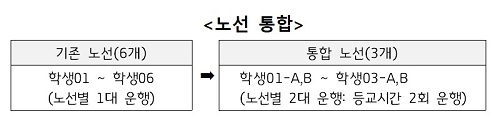 Çϱ³ ³ë¼±Àº ±âÁ¸Ã³·³ ¸ðµç Çб³¸¦ °æÀ¯ÇÏ´Â ¹æ½Ä ´ë½Å, Çб³º° ±¸¿ªÀ» A±¸¿ª°ú B±¸¿ªÀ¸·Î ³ª´² ³ë¼±º°·Î 2ȸ(¿ÀÈÄ 3½Ã, ¿ÀÈÄ 5½Ã) ¿îÇàÇÑ´Ù.