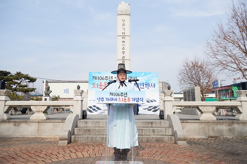 ¾çÁÖ½Ã(½ÃÀå °¼öÇö)°¡ 1ÀÏ ¿ÀÀü ‘±¤Àû¸é °¡·¡ºñ 3.1¿îµ¿ ±â³ä °ø¿ø’¿¡¼ ‘Á¦106ÁÖ³â 3.1¿îµ¿ ±â³ä½Ä’À» °ÅÇàÇß´Ù°í ¹àÇû´Ù.