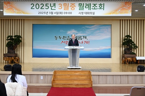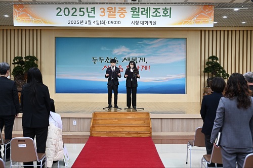 µ¿µÎõ½Ã(½ÃÀå ¹ÚÇü´ö)´Â 4ÀÏ ½Ãû ´ëȸÀǽǿ¡¼ 3¿ù Áß ¸í¿¹½ÃÀåÀ¸·Î À§ÃËµÈ îñ µ¿µÎõ½Ã »ýȰüÀ°ÇùÀÇȸ Á¶¼º¹® ȸÀåÀ» ºñ·ÔÇÑ Á÷¿øµéÀÌ Âü¼®ÇÑ °¡¿îµ¥ ¿ù·ÊÁ¶È¸¸¦ °³ÃÖÇß´Ù.