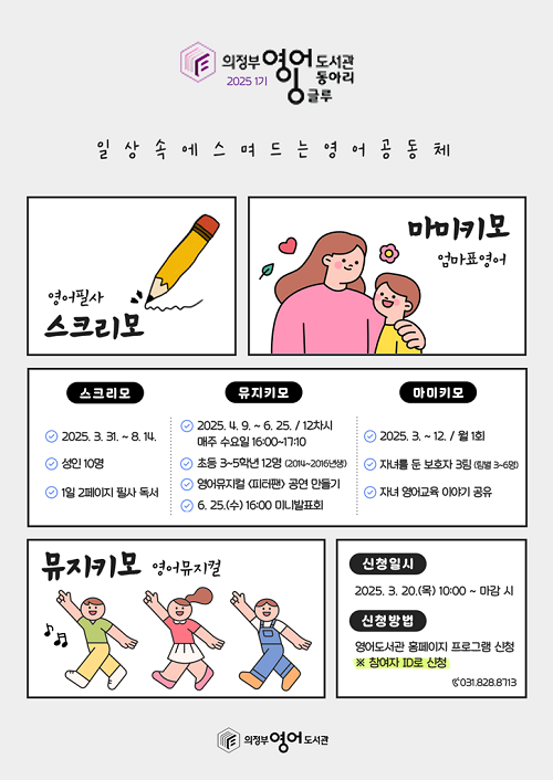 À×±Û·ç 1±â Âü¿©ÀÚ´Â 3¿ù 20ÀÏ ¿ÀÀü 10½ÃºÎÅÍ ÀÇÁ¤ºÎ¿µ¾îµµ¼°ü ´©¸®Áý(www.uilib.go.kr/english)¿¡¼ ¼±Âø¼øÀ¸·Î Á¢¼öÇÑ´Ù. ÀÚ¼¼ÇÑ ³»¿ëÀº ¿µ¾îµµ¼°ü ´©¸®ÁýÀ» Âü°íÇϰųª ´ã´çÀÚ(031-828-8713)¿¡°Ô ¹®ÀÇÇϸé È®ÀÎÇÒ ¼ö ÀÖ´Ù.
