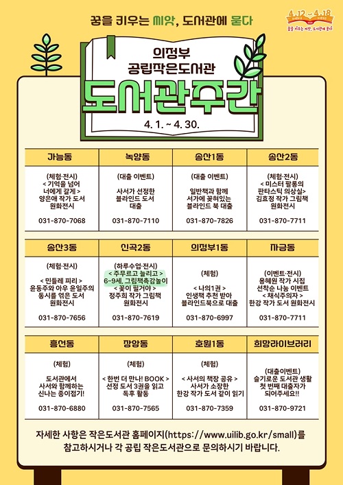 ÀÇÁ¤ºÎ½Ã(½ÃÀå ±èµ¿±Ù) °ø¸³ ÀÛÀºµµ¼°üÀº ‘Á¦3ȸ µµ¼°üÀÇ ³¯’°ú ‘Á¦61ȸ µµ¼°üÁÖ°£’À» ¸Â¾Æ 4¿ù 1ÀϺÎÅÍ 30ÀϱîÁö ´Ù¾çÇÑ Ã¼ÇèȰµ¿°ú À̺¥Æ®¸¦ ¿î¿µÇÑ´Ù.