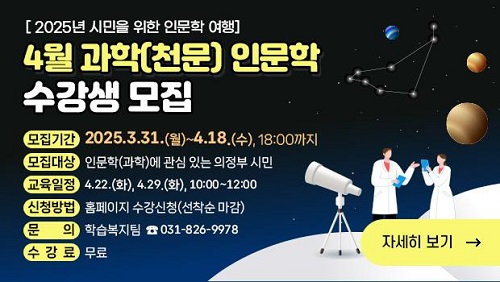 Àç´Ü¹ýÀÎ ÀÇÁ¤ºÎ½ÃÆò»ýÇнÀ¿ø(¿øÀå À¯»óÁø)Àº 4¿ù 22Àϰú 29ÀÏ ÀÇÁ¤ºÎ õ¹®´ë¿¡¼ ‘2025³â ½Ã¹ÎÀ» À§ÇÑ Àι®ÇÐ ¿©Çà, 4¿ù °úÇÐ(õ¹®) °ÁÂ’¸¦ ¿î¿µÇÑ´Ù.