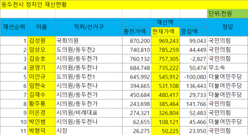 Ãʼ± ´ç¼± Ã¹ÇØÀÎ 2016³â Àç»ê½Å°í¾×ÀÌ 4¾ï9,667¸¸¿øÀÌ´ø ±è ÀÇ¿øÀº 2022³â ¸» ±âÁØ 10¾ï915¸¸¿øÀ¸·Î Àç»ê¼øÀ§ 1À§¸¦ Â÷ÁöÇÑ µÚ ÇöÀç±îÁö ÀÌ ÀÚ¸®¸¦ À¯ÁöÇϰí ÀÖ´Ù.