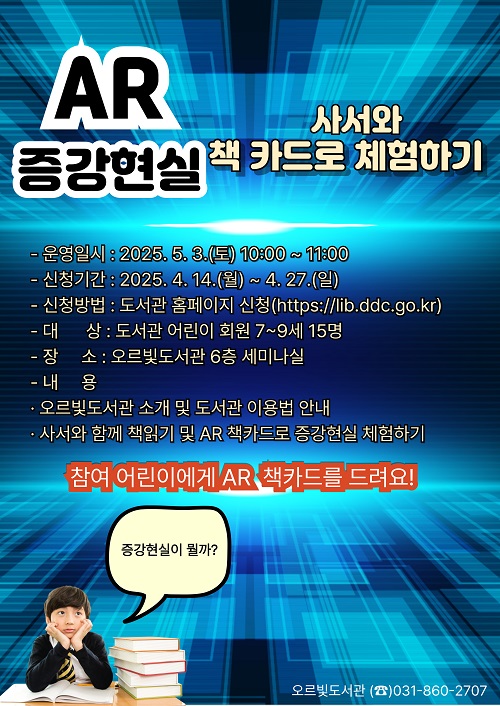 ÇÁ·Î±×·¥Àº ¿À¸£ºûµµ¼°ü¿¡ ´ëÇÑ ¼Ò°³¿Í µµ¼°ü ÀÌ¿ë¹ý ¾È³» ÈÄ, »ç¼¿Í ÇÔ²² Ã¥À» Àд ½Ã°£À» °®µµ·Ï ±¸¼ºµÈ´Ù. Áõ°Çö½Ç ÄÜÅÙÃ÷°¡ ´ã±ä ‘Áõ°Çö½Ç(AR) åīµå’¸¦ Ȱ¿ëÇØ Ã¥ ¼Ó Àå¸éÀÌ »ì¾Æ ¿òÁ÷À̴ üÇè Ȱµ¿ÀÌ À̾îÁø´Ù. ¶ÇÇÑ Áõ°Çö½Ç(AR) Ä«µå ŰƮ¸¦ Á¦°øÇÏ¿©, ¾î¸°À̵éÀÌ Áý¿¡¼µµ Á÷Á¢ üÇèÇÒ ¼ö ÀÖµµ·Ï Çß´Ù.
