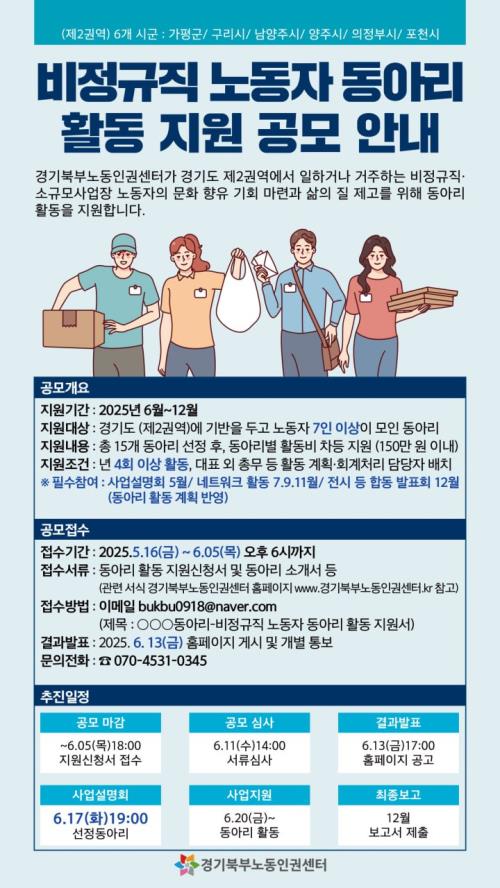 À̹ø »ç¾÷Àº °æ±âµµ Á¦2±Ç¿ª(°¡Æò±º, ±¸¸®½Ã, ³²¾çÁÖ½Ã, ¾çÁÖ½Ã, ÀÇÁ¤ºÎ½Ã, Æ÷õ½Ã)¿¡ ±â¹ÝÇϰí, ¿¬°£ 4ȸ ÀÌ»ó Ȱµ¿, 7ÀÎ ÀÌ»óÀ¸·Î ±¸¼ºµÈ µ¿¾Æ¸®¸¦ ¸¸µé°íÀÚ ÇÏ´Â ³ëµ¿ÀÚ¶ó¸é ´©±¸³ª ½ÅûÇÒ ¼ö ÀÖ´Ù.