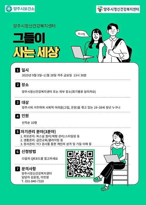 Áö¿ø ´ë»óÀº ¾çÁֽÿ¡ °ÅÁÖÇÏ´Â 19¼¼ ÀÌ»ó 39¼¼ ÀÌÇÏ Ã»³âÀ¸·Î, Âü¿©¸¦ Èñ¸ÁÇÒ °æ¿ì ÀüÈ(031-840-7320) ¶Ç´Â Àü´ÜÁö ³» QRÄڵ带 ÅëÇØ ½ÅûÇÒ ¼ö ÀÖ´Ù.