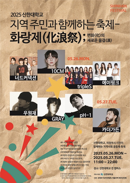 ½ÅÇÑ´ëÇб³(ÃÑÀå °¼ºÁ¾)´Â ¿À´Â 5¿ù 25ÀϺÎÅÍ 27ÀϱîÁö ½ÅÇÑ´ëÇб³ Ä·ÆÛ½º¸¦ ¹«´ë·Î ´ë±Ô¸ð »ó»ýÇü ¹®È¿¹¼úÃàÁ¦ÀÎ ‘ȶûÁ¦(ûùÕÈð®)’¸¦ °³ÃÖÇÑ´Ù°í ¹àÇû´Ù. ‘ȶûÁ¦’´Â ´Ü¼øÇÑ ´ëÇÐ ÃàÁ¦¸¦ ³Ñ¾î, Áö¿ª»çȸ¿ÍÀÇ ¿¬´ë¿Í ±Û·Î¹ú ¹®È ±³·ù¸¦ ÇÙ½É °¡Ä¡·Î »ï´Â ½ÅÇÑ´ëÇб³ÀÇ ¹Ì·¡Çü ÃàÁ¦ Ç÷§ÆûÀÌ´Ù. ‘ȶû(ûùÕÈ)’Àº ‘º¯ÈÇÒ È(ûù)’¿Í ‘¹°°á ¶û(ÕÈ)’ÀÇ ÇÕ¼º¾î·Î, Áö¿ª°ú ´ëÇÐ, Çлý°ú ½Ã¹ÎÀÌ ÇÔ²² ¸¸µé¾î°¡´Â º¯ÈÀÇ ¹°°áÀ» »ó¡ÇÑ´Ù.