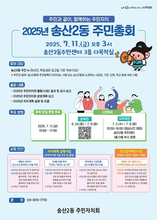 ÀÇÁ¤ºÎ½Ã ¼Û»ê2µ¿Áֹμ¾ÅÍ(µ¿Àå ÀÌÇü¼ø)´Â ¼Û»ê2µ¿ ÁÖ¹ÎÀÚġȸ(ȸÀå ÀÌ»óºØ)°¡ ‘2025³â ¼Û»ê2µ¿ ÁÖ¹ÎÃÑȸ’¸¦ ¾ÕµÎ°í 2026³â ÀÚÄ¡°èȹ »ç¾÷¿¡ ´ëÇÑ ÁÖ¹ÎÀÇ ÀǰßÀ» µè°íÀÚ ¿Â¶óÀη¿ÀÇÁ¶óÀÎ »çÀüÅõÇ¥¸¦ ½Ç½ÃÇÑ´Ù°í 23ÀÏ ¹àÇû´Ù.
