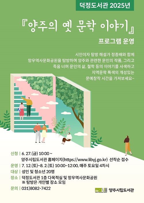¼ö°»ý ¸ðÁýÀº ¾çÁֽø³µµ¼°ü ȨÆäÀÌÁö¿¡¼ ¼±Âø¼øÀ¸·Î ÁøÇàµÇ°í ÀÖÀ¸¸ç ´ë»óÀº û¼Ò³â ¹× ¼ºÀÎ 20¸íÀÌ´Ù. ÀÚ¼¼ÇÑ »çÇ×Àº ¾çÁֽø³µµ¼°ü ´©¸®Áý(https://www.libyj.go.kr/djlib)À» Âü°íÇϰųª ´öÁ¤µµ¼°ü(031-8082-7422)·Î ¹®ÀÇÇÏ¸é ¾È³»¸¦ ¹ÞÀ» ¼ö ÀÖ´Ù.
