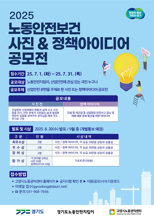 »ê¾÷¾ÈÀü¿¡ °ü½É ÀÖ´Â ±¹¹Î ´©±¸³ª Âü¿© °¡´ÉÇϸç, °í¾ç½Ã³ëµ¿±ÇÀͼ¾ÅÍ È¨ÆäÀÌÁö(www.gynodong.org)¿¡¼ ½Åû¼¸¦ ³»·Á¹Þ¾Æ ÀüÀÚ¿ìÆí(gynodong@daum.net)À¸·Î Á¦ÃâÇÏ¸é µÈ´Ù.