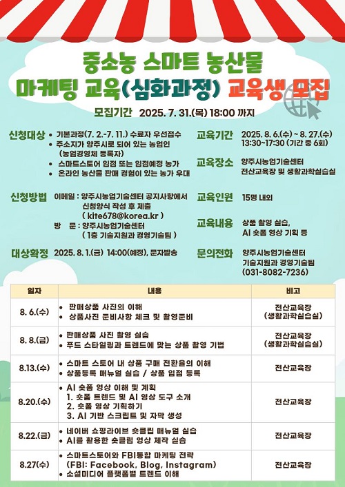 ¾çÁֽð¡ ³ó¾÷ÀÎÀ» ´ë»óÀ¸·Î ½º¸¶Æ® ±â¼ú ¹× ¿Â¶óÀÎ ¸¶ÄÉÆÃ ¿ª·®°È¸¦ À§ÇÑ¡¸2025³â Áß¼Ò³ó ½º¸¶Æ® ³ó»ê¹° ¸¶ÄÉÆÃ ±³À°(½ÉȰúÁ¤)¡¹±³À°»ýÀ» 15¸í ³»¿Ü·Î ¸ðÁýÇÑ´Ù.