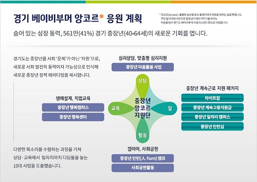 ÇÑÆí, °æ±âµµ´Â ÁßÀå³âÃþÀ» »çȸÀÇ ‘¹®Á¦’°¡ ¾Æ´Ñ ‘ÀÚ¿ø’À¸·Î ÀνÄÇϰí, »õ·Î¿î »çȸ ¹ßÀüÀÇ µ¿·ÂÀÌÀÚ °¡´É¼ºÀ¸·Î »ï±â À§ÇØ ³»³âµµ ‘°æ±âµµ º£À̺ñºÎ¸Ó ¾ÓÄÚ¸£ ÀÀ¿ø°èȹ’À» ¼ö¸³ÇÒ ¿¹Á¤ÀÌ´Ù. °èȹ¿¡´Â »ó´ã, ±³À°, ÀÏÀÚ¸® Áö¿ø µî 10´ë ÇÙ½É »ç¾÷ÀÌ Æ÷ÇԵǸç, 10´ë »ç¾÷ Áß Çϳª·Î ‘°æ±âµµ ÁßÀå³â °è¼Ó±Ù·Î Áö¿ø ÆÐŰÁö’°¡ ÃßÁøµÈ´Ù.
