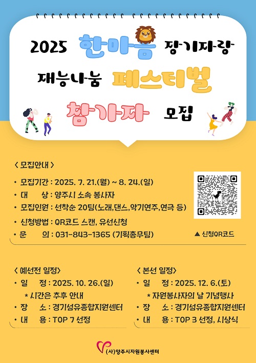 ¾çÁÖ½ÃÀÚ¿øºÀ»ç¼¾ÅÍ(ÀÌ»çÀå °¼öÇö)´Â ÀÚ¿øºÀ»çÀÚµéÀÇ ¼ûÀº ³¢¿Í Àç´ÉÀ» ¹ßÈÖÇÒ ¼ö ÀÖ´Â ‘2025 ÇѸ¶À½ Àå±âÀÚ¶û Àç´É³ª´® Æä½ºÆ¼¹ú’ Âü°¡ÀÚ¸¦ ¸ðÁýÇÑ´Ù.