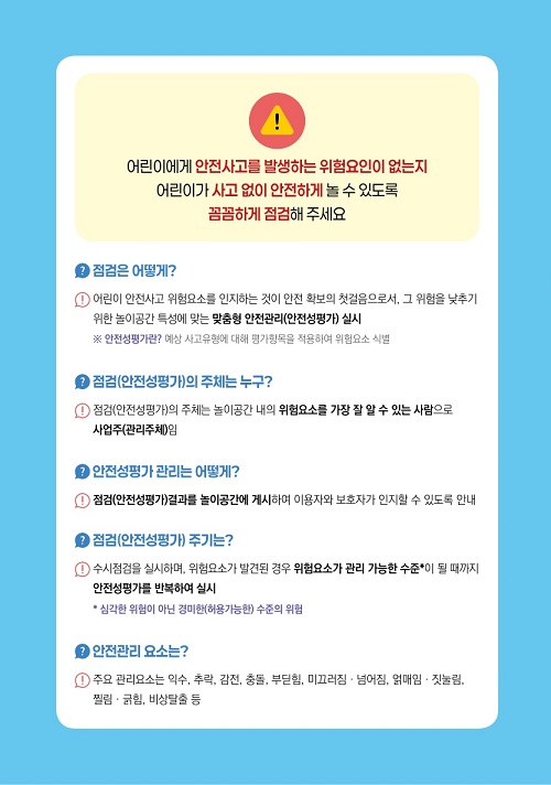 È«º¸¹°¿¡´Â ½Ã¼³ ¿î¿µÀÚ°¡ ½º½º·Î Á¡°ËÇÒ ¼ö ÀÖ´Â ‘¹«ÀγîÀ̽ü³ ¿î¿µ°ü¸®ÀÚ Á¡°Ë¹æ¹ý’°ú ÇÔ²², ¡ãÀͼö ¡ã°¨Àü ¡ãÂñ¸²·±ÜÈû ¡ãÃß¶ô·Ãæµ¹ ¡ã¹Ì²ô·¯Áü ¹× ³Ñ¾îÁü µî ÁÖ¿ä »ç°íÀ¯Çüº° ¿¹¹æ¹ýÀÌ Æ÷ÇԵƴÙ. ƯÈ÷ º¸È£ÀÚÀÇ ÁÖÀǸ¦ À̲ø ¼ö ÀÖ´Â ¾È³»¹æ½Ä°ú ½Ã¼³ ¿î¿µÀÚ Áß½ÉÀÇ ½Çõ »çÇ×µµ ¾È³»ÇØ, ¾ÈÀüÇÑ ÀÌ¿ë ȯ°æ ¸¶·Ã¿¡ µµ¿òÀÌ µÇµµ·Ï ±¸¼ºµÆ´Ù.