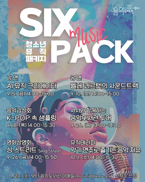 ÀÇÁ¤ºÎÀ½¾Çµµ¼°üÀº 9¿ù 5ÀϺÎÅÍ 10¿ù 1ÀϱîÁö Áö¿ª û¼Ò³âÀ» ´ë»óÀ¸·Î 6°¡Áö À½¾Ç °æÇè ÆÐŰÁö ‘½Ä½ºÆÑ(6-Pack)’À» ¿î¿µÇÑ´Ù.