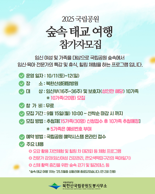 ±¹¸³°ø¿ø ½£¼Ó ű³ ÇÁ·Î±×·¥Àº ÀӽźΠ¹× °¡Á·À» ´ë»óÀ¸·Î ±¹¸³°ø¿ø ½£¼Ó¿¡¼ ÀӽŷÀ°¾Æ Àü¹®°¡ Ư° ¹× ¿À°¨ Èú¸µ üÇèÀÇ ±âȸ¸¦ ¹«·á·Î Á¦°øÇÏ´Â ÇÁ·Î±×·¥ÀÌ´Ù. À̹ø ÇÁ·Î±×·¥Àº ÅÂ¾Æ¿Í ÇÔ²² ¸¶À½À» Ä¡À¯Çϰí, Ãâ»ê°ú À°¾ÆÁغñ¸¦ ÀÚ¿¬°ú ±³°¨Çϸç ÇÒ ¼ö ÀÖ´Â ½Ã°£À¸·Î ±¸¼ºµÇ¾î ÀÖ´Ù.