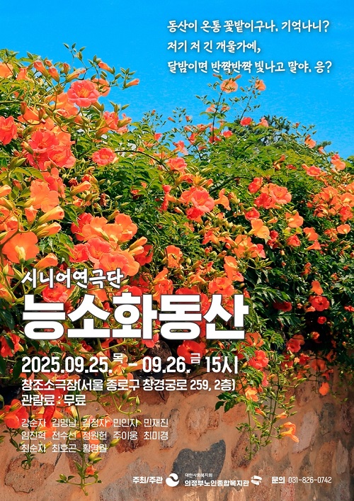À̹ø °ø¿¬Àº ¼±¹è½Ã¹Î ¿¬±Øµ¿¾Æ¸® ȸ¿ø 13¸íÀÌ ¹è¿ì·Î Âü¿©ÇÑ´Ù. ¾ÈÅæ üȣÇÁÀÇ °íÀü ‘º¢²Éµ¿»ê’À» ³ëÀÎÀÇ ½Ã¼±¿¡¼ »õ·Ó°Ô ÀçÇØ¼®Çß´Ù. ´É¼ÒÈ µ¿»ê¿¡¼ ¸¸³¯ ¼ö ÀÖ´Â µûµíÇÑ »ç¶÷µé°úÀÇ »ç¶ûÀ» ÀüÇÒ ¿¹Á¤ÀÌ´Ù.