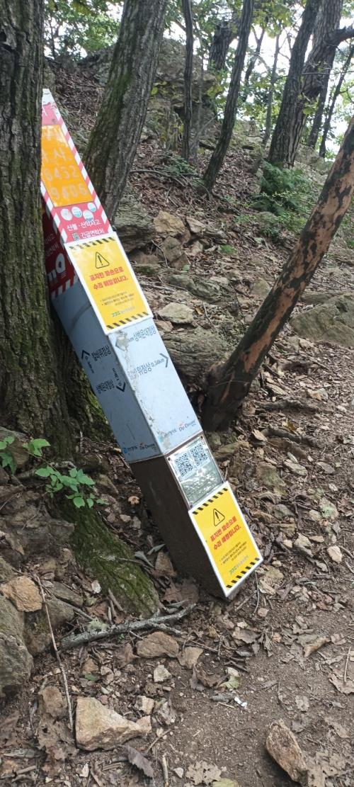 Áö³ 5¿ù27ÀÏ ¼Ò¿ä»êÀ¸·Î ¿À¸£´Â ÁÖ¿ä µî»ê·Î¿¡ ¼³Ä¡µÈ »ê¾ÇÀ§Ä¡Ç¥ÁöÆÇ ÀϺδ ºÎ·¯Á® ³ª¹«¿¡ °ÉÃÄ Àְųª ¶¥¹Ù´Ú¿¡ ³ªµß±¼°í ÀÖ¾ú´Ù. ¾ûÅ͸® Á¢Âø ÀÛ¾÷À¸·Î ½ÃÆ®Áö°¡ ÀÌÅ»µÈ »ê¾ÇÀ§Ä¡Ç¥ÁöÆÇµµ ÀÖ¾ú´Ù.