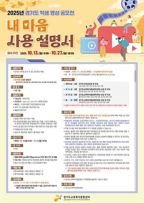 °æ±âµµ±³À°º¹ÁöÁ¾ÇÕ¼¾ÅÍ(°üÀå ÇǼºÁÖ)°¡ °æ±âµµ±³À°Ã» ¼Ò¼Ó ÃÊ Áß °íµîÇб³ ÇлýµéÀ» ´ë»óÀ¸·Î ‘2025³â °æ±âµµ Çлý ¿µ»ó °ø¸ðÀü’À» °³ÃÖÇÑ´Ù.