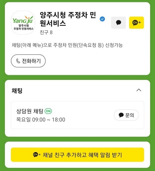 ÀÌ¿ë ¹æ¹ýÀº īī¿ÀÅå »ó´Ü °Ë»öâ¿¡ “¾çÁÖ½Ãû ÁÖÁ¤Â÷ ¹Î¿ø¼ºñ½º”¸¦ °Ë»öÇÏ¿© ÇØ´ç À̸§ÀÇ Ã¤³ÎÀ» Ãß°¡ÇÏ°í °øÁö ¹× ¼Ò½Ä È®ÀÎ ¹× ½Ç½Ã°£ äÆÃÀ» ÀÌ¿ëÇÏ¸é µÈ´Ù.