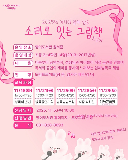 ÀÇÁ¤ºÎ½Ã(½ÃÀå ±èµ¿±Ù) µµ¼°üÀº 11¿ù, 2025³â ¾î¸°ÀÌ ÀÔü³¶µ¶ ‘¼Ò¸®·Î ÀÕ´Â ±×¸²Ã¥’À» ÃÑ 5ȸ¿¡ °ÉÃÄ ÀÇÁ¤ºÎ¿µ¾îµµ¼°ü¿¡¼ ¿î¿µÇÑ´Ù.