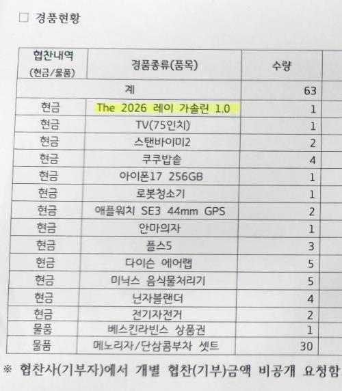 ÀÇÁ¤ºÎ¹®ÈÀç´ÜÀº ÀÌ µ·À¸·Î 2026 ·¹ÀÌ ÀÚµ¿Â÷(1õ816¸¸¿ø), 75ÀÎÄ¡ TV(289¸¸¿ø), ½ºÅĹÙÀ̹Ì2 TV(258¸¸¿ø), Àü±âÀÚÀü°Å(2°³ 270¸¸¿ø), ¾È¸¶ÀÇÀÚ(182¸¸¿ø), ´ÙÀ̽¼ ¿¡¾î·¦(5°³ 279¸¸¿ø), ÄíÄí¹ä¼Ü(4°³ 223¸¸¿ø), ¾ÆÀÌÆù17(129¸¸¿ø) µî 63Á¡À» ¸¶·ÃÇß´Ù. º£½ºÅ²¶óºó½º »óǰ±Ç(30¸¸¿ø)°ú ¸Þ³ë¸®ÀÚ·´Ü»ïÄÞºÎÂ÷ ¼¼Æ®(30°³ 102¸¸¿ø)¸¸ ¹°Ç°À¸·Î ¹Þ¾Ò´Ù.