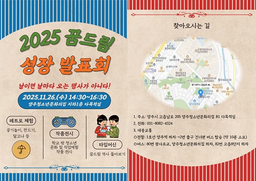 ¾çÁÖ½ÃÇб³¹Ûû¼Ò³âÁö¿ø¼¾ÅÍ(ÀÌÇÏ ¾çÁֽà ²Þµå¸²)°¡ ¿À´Â 11¿ù 26ÀÏ ¿ÀÈÄ 2½Ã 30ºÐºÎÅÍ 4½Ã 30ºÐ±îÁö ¾çÁÖû¼Ò³â¹®ÈÀÇÁý ÁöÇÏ1Ãþ ´Ù¸ñÀû½Ç¿¡¼ ‘2025 ²Þµå¸² ¼ºÀå¹ßǥȸ’¸¦ °³ÃÖÇÑ´Ù. À̹ø Çà»ç´Â Çб³ ¹Û û¼Ò³âµéÀÌ ÇÑ ÇØ µ¿¾È ¹è¿î ³»¿ë°ú ¼ºÀåÇÑ ¸ð½ÀÀ» ÇÔ²² ³ª´©±â À§ÇØ ¸¶·ÃµÆ´Ù.