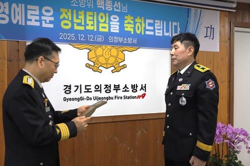ÀÇÁ¤ºÎ¼Ò¹æ¼­´Â 12¿ù 12ÀÏ ¼ÒȸÀǽǿ¡¼­ 2025³â ÇÏ¹Ý±â ¼Ò¹æ°ø¹«¿ø Á¤³âÅðÀÓ½ÄÀ» °³ÃÖÇϰí, 30¿© ³â°£ ¼Ò¹æÇàÁ¤ ¹ßÀü°ú Àç³­ÇöÀå¿¡¼­ ¸ÃÀº ¹Ù ¼ÒÀÓÀ» ´ÙÇØ ¿Â ¹éÁ¾¼± ¼Ò¹æÀ§ÀÇ °ø·Î¸¦ ±â¸®´Â ½Ã°£À» °¡Á³´Ù.