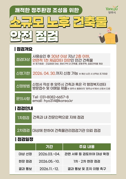 ¾ÈÀüÁ¡°ËÀ» Èñ¸ÁÇÏ´Â °ÇÃ๰ ¼ÒÀ¯ÀÚ³ª °ü¸®ÀÚ´Â ¿À´Â 4¿ù 30ÀϱîÁö ½Åû¼¸¦ ÀÛ¼ºÇØ ¾çÁÖ½Ãû 1Ãþ °ÇÃà°ú ¶Ç´Â °¢ À¾¸éµ¿ ÇàÁ¤º¹Áö¼¾ÅÍ¿¡ ¹æ¹® Á¢¼öÇϰųª ÀüÀÚ¿ìÆí(hyo314@korea.kr)·Î Á¦ÃâÇÏ¸é µÈ´Ù. ½Åû¼ ¼½ÄÀº ¾çÁÖ½Ãû ´©¸®Áý ‘¾çÁּҽĒ¿¡¼ ³»·Á¹ÞÀ» ¼ö ÀÖ´Ù.
