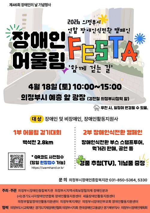 Á¦46ȸ Àå¾ÖÀÎÀÇ ³¯À» ±â³äÇØ ¿À´Â 4¿ù 18ÀÏ ¿ÀÀü 10½ÃºÎÅÍ ¿ÀÈÄ 3½Ã±îÁö ÀÇÁ¤ºÎ¿¹ÃÑ ¾Õ ±¤Àå(°æÀüö ÀÇÁ¤ºÎ½Ãû¿ª ¾Õ)¿¡¼ ‘2026 ÀÇÁ¤ºÎ½Ã ¿¬ÇÕ Àå¾ÖÀνÄÀüȯ Ä·ÆäÀÎ-Àå¾ÖÀÎ ¾î¿ï¸² FESTA ÇÔ²² °È´Â ±æ’ÀÌ °³ÃÖÇÑ´Ù.