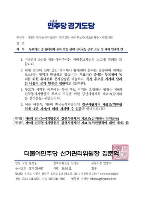 ÀÌ¿Í °ü·Ã, ¹ÎÁÖ´ç °æ±âµµ´çÀº 4¿ù11ÀÏ ±âÃÊ´ÜüÀå ¹× Áö¹æÀÇ¿øµé¿¡°Ô ‘ÅõÇ¥±â°£ Áß ÈÞ´ëÀüÈ ¹®ÀÚ ¹ß¼Û °ü·Ã ¼±°Å¿îµ¿ Áؼö ¿äû ¹× Á¦ÀçÀÇ °Ç’À̶ó´Â °ø¹®À» º¸³» “ƯÁ¤ È常¦ ÁöÁöÇØ ´Þ¶ó´Â ³»¿ëÀÇ ¹®ÀÚ ¹ß¼ÛÀ» ±ÝÁöÇÑ´Ù”°í ¾È³»Çß´Ù. À̸¦ ¾î±æ °æ¿ì “Á¦9ȸ Áö¹æ¼±°Å °æ¼±½ÃÇ༼Ģ Á¦41Á¶¿¡ µû¶ó Á¦Á¦ÇÒ ¼ö ÀÖ´Ù”°í ¹àÇû´Ù.