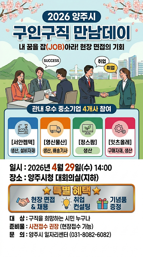 Çà»ç´Â ¿À´Â 4¿ù 29ÀÏ ¿ÀÈÄ 2½ÃºÎÅÍ 4½Ã±îÁö ¾çÁÖ½Ãû ´ëȸÀǽǿ¡¼­ ÁøÇàµÇ¸ç, ±¸Á÷ÀÚ´Â »çÀü ½Åû ¶Ç´Â Çà»ç ´çÀÏ ¿ÀÈÄ 1½Ã 30ºÐºÎÅÍ ÇöÀå Á¢¼ö ÈÄ ¸éÁ¢¿¡ Âü¿©ÇÒ ¼ö ÀÖ´Ù. Âü¿©¸¦ Èñ¸ÁÇÏ´Â ±¸Á÷ÀÚ´Â À̷¼­ µî Áö¿ø ¼­·ù¸¦ ÁöÂüÇØ¾ß ÇÑ´Ù.