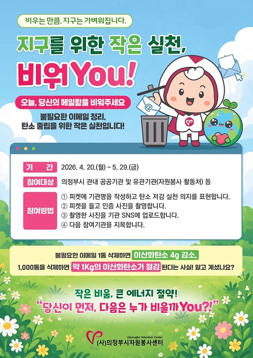 ÀÇÁ¤ºÎ½ÃÀÚ¿øºÀ»ç¼¾ÅÍ´Â ÀÚ¿ø¾Èº¸ À§±â °æ°è ´Ü°è ¹ß·É¿¡ µû¸¥ ¿¡³ÊÁö Àý¾à Á¤Ã¥¿¡ ¸ÂÃç Áö³ 4¿ù 20ÀϺÎÅÍ Åº¼Ò Àú°¨ ½ÇõÀ» À§ÇÑ ‘Áö±¸¸¦ À§ÇÑ ÀÛÀº ½Çõ, ºñ¿öyou’ ¸±·¹ÀÌ Ä·ÆäÀÎÀ» ½ÃÀÛÇß´Ù.