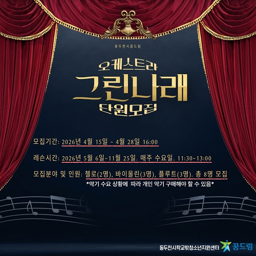 µ¿µÎõ½ÃÇб³¹Ûû¼Ò³âÁö¿ø¼¾ÅÍ(¼¾ÅÍÀå Ȳ»ó¿¬)´Â 2026³âÀ» ¸Â¾Æ Çб³ ¹Û û¼Ò³âÀ» ´ë»óÀ¸·Î ‘±×¸°³ª·¡ ¿ÀÄɽºÆ®¶ó’ ½Å±Ô ´Ü¿øÀ» ¸ðÁýÇÑ´Ù.