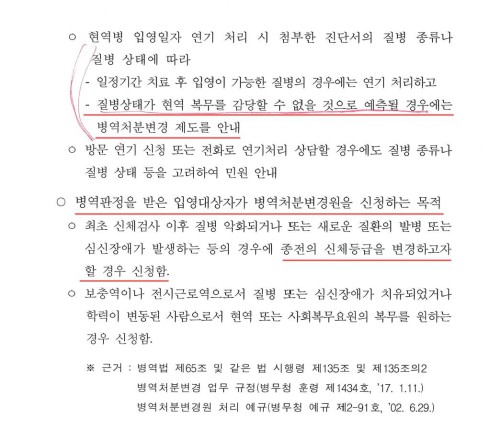 ÇöÀç º´¹«Ã»Àº Çö¿ªº´ ÀÔ¿µ ÀÏÀÚ ¿¬±â ó¸® ½Ã ÷ºÎÇÑ Áø´Ü¼ÀÇ Áúº´ Á¾·ù³ª Áúº´ »óÅ¿¡ µû¶ó ¡ãÀÏÁ¤ ±â°£ Ä¡·á ÈÄ ÀÔ¿µÀÌ °¡´ÉÇÑ Áúº´ÀÇ °æ¿ì¿¡´Â ¿¬±â ó¸®ÇÏ°í ¡ãÁúº´»óŰ¡ Çö¿ª º¹¹«¸¦ °¨´çÇÒ ¼ö ¾øÀ» °ÍÀ¸·Î ¿¹ÃøµÉ °æ¿ì¿¡´Â º´¿ªÃ³ºÐº¯°æ Á¦µµ¸¦ ¾È³»Çϰí ÀÖ´Ù.