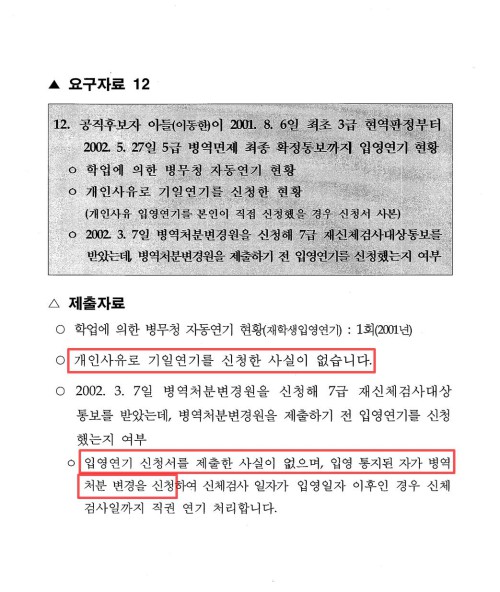 ÇÏÁö¸¸ À̵¿ÇѾ¾ÀÇ º´ÀûÁõ¸í¼¿Í º´¹«Ã» Á¦ÃâÀڷḦ È®ÀÎÇØº» °á°ú, À̵¿ÇѾ¾´Â ÀÔ¿µ¿¬±â ½Åû¼¸¦ Á¦ÃâÇÑ »ç½ÇÀÌ ¾ø¾úÀ½ÀÌ È®Àεưí, ÀÚ½ÅÀÌ ¹ÞÀº Çö¿ª(3±Þ) ½Åüµî±ÞÀÇ º¯°æÀ» ¿äûÇÏ´Â ‘º´¿ªÃ³ºÐº¯°æ¿ø’¸¸ Á¦ÃâÇß´ø °ÍÀ¸·Î È®ÀεƴÙ.