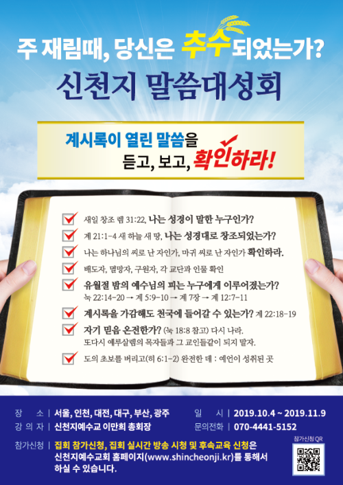 À̹ø ¸»¾¸´ë¼ºÈ¸´Â ¸ñȸÀÚ¿Í ½ÅÇлý, Á¾±³ÀÎ µî ´©±¸³ª Âü¿© °¡´ÉÇÏ¸ç ½ÅõÁö¿¹¼ö±³È¸ ȨÆäÀÌÁö(http://www.shincheonji.kr)¸¦ ÅëÇØ ½ÅûÇÏ¸é µÈ´Ù. Âü°¡ºñ´Â ¹«·áÀ̸ç ÀÚ¼¼ÇÑ ³»¿ëÀº ÀüÈ(070-4441-5152)·Î ¹®ÀÇÇÏ¸é µÈ´Ù.