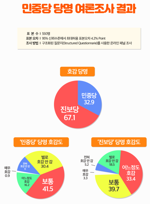 ¹ÎÁß´çÀÇ ±âº» Á¤Ã¥À» ‘¾î´À Á¤´çÀÇ ±âº» Á¤Ã¥’À̶ó°í Á¦½ÃÇÑ ÈÄ ÇØ´ç Á¤Ã¥À» °¡Áø Á¤´çÀÇ ´ç¸íÀ¸·Î¼ÀÇ È£°¨µµ¸¦ ¹°¾úÀ» ¶§, 2°³ ´ç¸í Áß ´õ È£°¨ °¡´Â ´ç¸íÀ¸·Î ‘Áøº¸´ç’À̶ó´Â ÀÀ´äÀÌ 56.8%·Î ¹ÎÁß´ç(43.2%)À̶ó´Â ÀÀ´äº¸´Ù ³ô°Ô ³ªÅ¸³µ´Ù. °¢°¢ÀÇ ´ç¸í¿¡ ´ëÇÑ È£°¨µµ¸¦ ¹°¾úÀ» ¶§´Â ‘Áøº¸´ç’¿¡ ´ëÇÑ È£°¨µµ´Â 36.5%, ‘¹ÎÁß´ç’¿¡ ´ëÇÑ È£°¨µµ´Â 27.1%¿´´Ù.