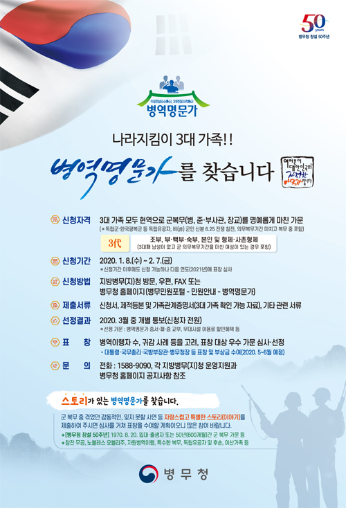 °æ±âºÏºÎº´¹«Áöû(ÁöûÀå ¿ÀÂù¼®)Àº 2020³âµµ º´¿ª¸í¹®°¡¸¦ Àû±Ø ¹ß±¼Çϱâ À§ÇØ 1¿ù8ÀϺÎÅÍ 2¿ù7ÀϱîÁö ÇÑ ´Þ°£ ÁýÁß Á¢¼ö ±â°£À» ¿î¿µÇÑ´Ù.