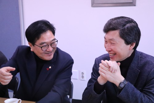 6ÀÏ ¿ÀÀü, ¿ì¿ø½Ä ±¹È¸ÀÇ¿øÀÌ ±è¹Îö ¿¹ºñÈ常¦ °Ý·ÁÇϱâ À§ÇØ ¼±°Å»ç¹«½Ç¿¡ ¹æ¹®ÇÏ¿© Áñ°Ì°Ô À̾߱⸦ ³ª´©°í ÀÖ´Ù.