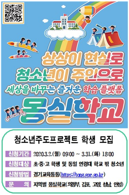 ¿ÃÇØ´Â ÃÊ·Áß·°í Çлý°ú µ¿ÀÏ ¿¬·É´ë Çб³ ¹Û û¼Ò³âÀ» ´ë»óÀ¸·Î ÃÑ 32°³ °úÁ¤¿¡ Âü¿©ÇÒ Ã»¼Ò³âÀ» ¸ðÁýÇÑ´Ù. ½ÅûÀº °æ±â±³À°ÅëÅë ȨÆäÀÌÁö(https://tong.goe.go.kr)¿¡¼ ÇÏ¸é µÈ´Ù.