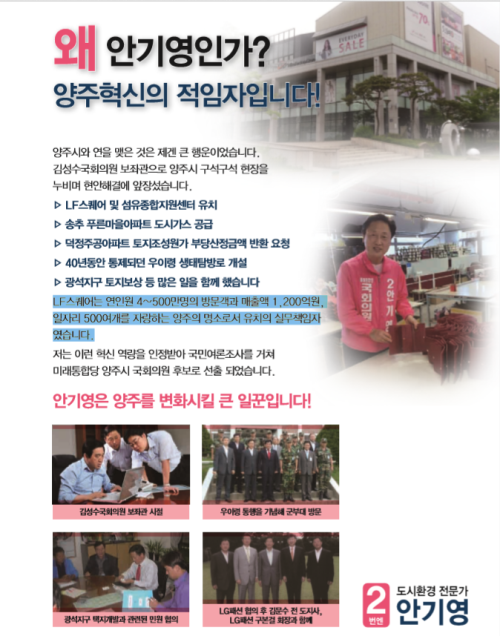 ¾È±â¿µ(57) ¹Ì·¡ÅëÇÕ´ç ¾çÁÖ ±¹È¸ÀÇ¿ø Èĺ¸ÀÇ ¼±°Å°øº¸¹°¿¡ ³ª¿À´Â ÀϺΠ³»¿ë ¶§¹®¿¡ ¼³¿Õ¼³·¡ ³í¶õÀÌ Àϰí ÀÖ´Ù.